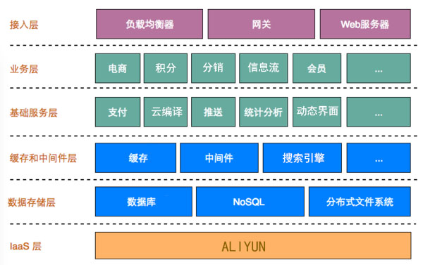 系统搭建在阿里云平台上,采用java+纯原生开发,兼有安全、可靠、可扩展的特性。整个后台服务分为laas层,数据存储层,缓存和中间件层,基础业务层,接入层。